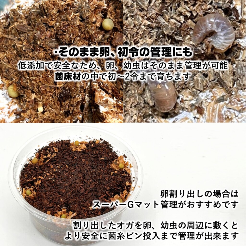 割り出したオガを卵、幼虫の周辺に敷くとより安全に菌糸ビン投入まで管理が出来ます。